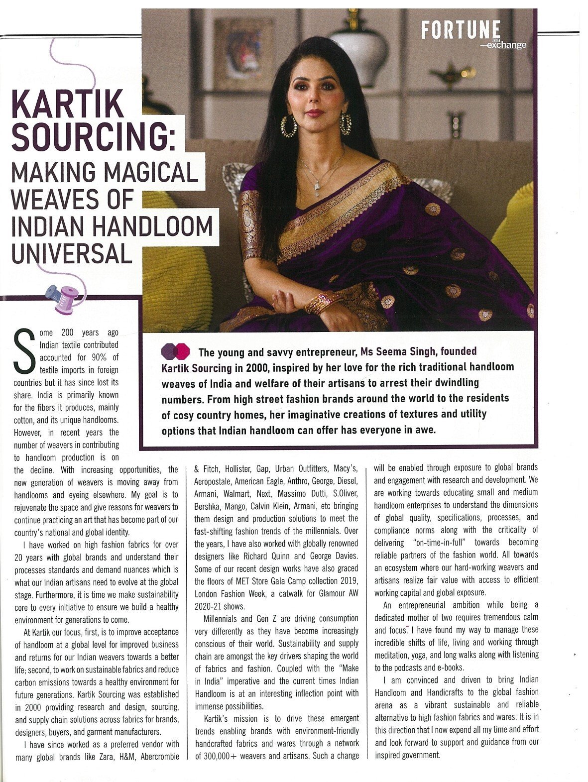 - Feature | Forbes Magazine 2021 : Article on reviving the handloom & handicraft sector to promote sustainable products and create employment for weavers and artisans.